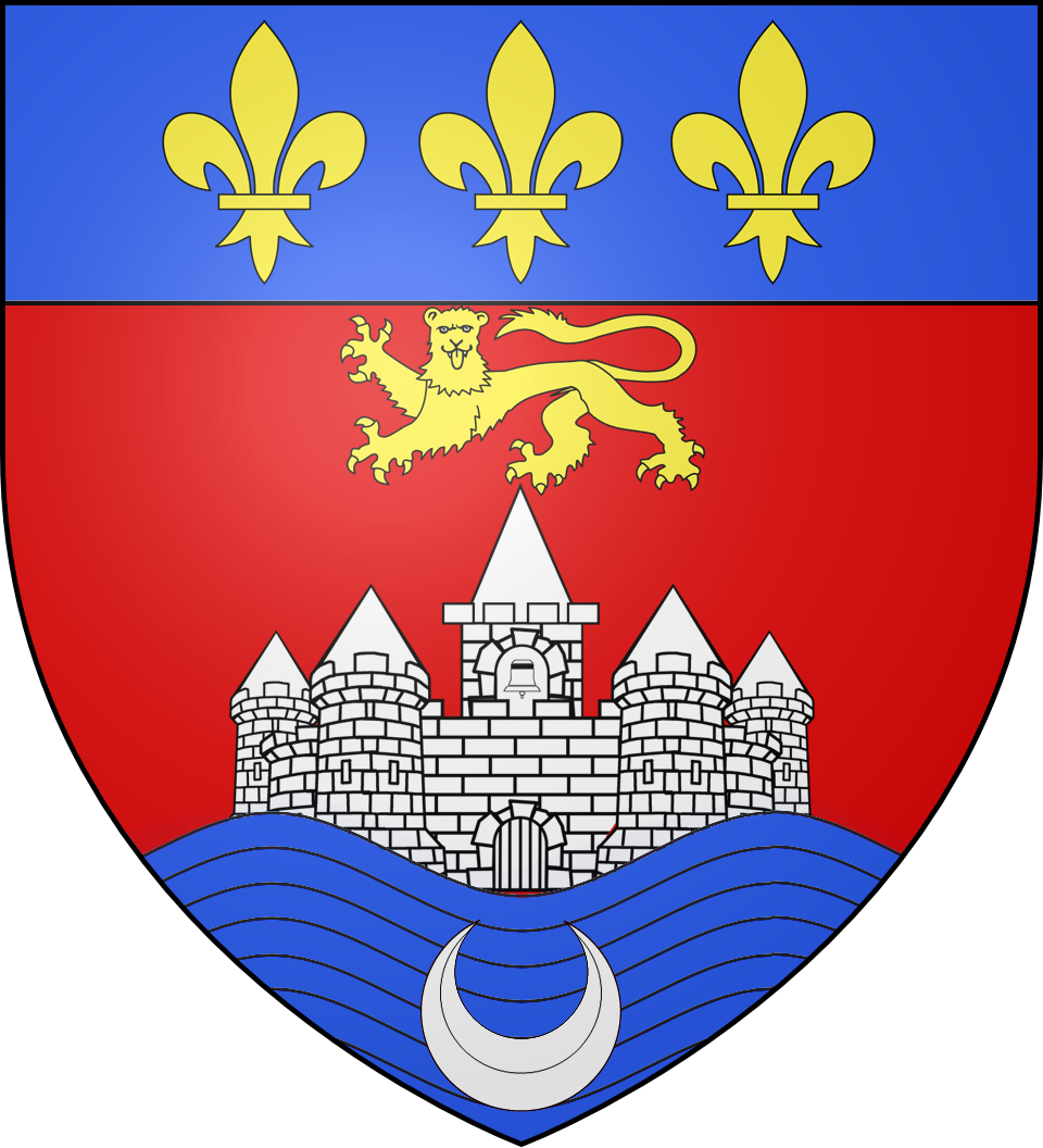 «De gueules au château de quatre tours crénelées et couvertes d'argent, hersé et sommé d'un clocher du même portant une cloche d'argent, le tout maçonné de sable, surmonté d'un léopard d'or, posé sur des ondes d'azur mouvant de la pointe et chargées d'un croissant d'argent; au chef cousu d'azur semé de fleurs de lis d'or.»